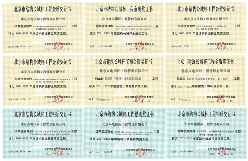 近日,北京市工程建設管理協會頒發了2021-2022年度(第一批)北京市建筑長城杯工程單位獲獎證書,中國電工所屬興電國際9個項目獲此榮譽。其中4個項目榮獲“結構長城杯金獎、2個項目榮獲“竣工長城杯”金獎、3個項目榮獲 “結構長城杯”銀獎,截止目前,興電國際已有180余項工程榮獲北京市“長城杯”獎項